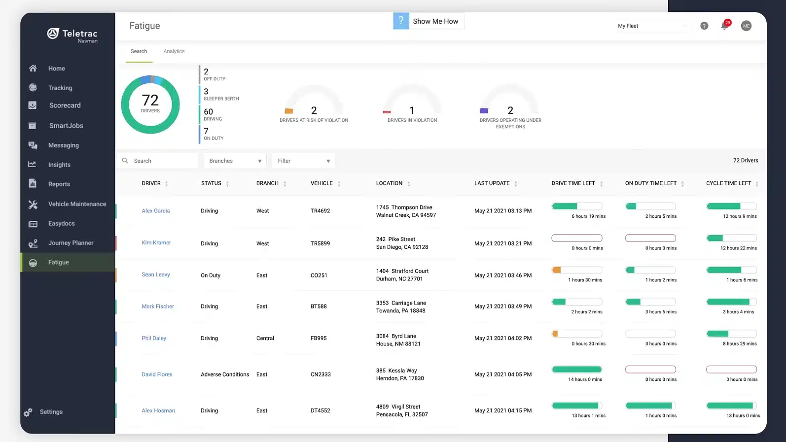 Teletrac Navman fokus pada kepatuhan regulasi armada (compliance), analisis risiko pengemudi, dan efisiensi bahan bakar. Fleet management software ini menggunakan AI untuk menilai perilaku sopir dan memberikan Driver Score dengan indikator seperti speeding, seat belt usage, dan idling time.