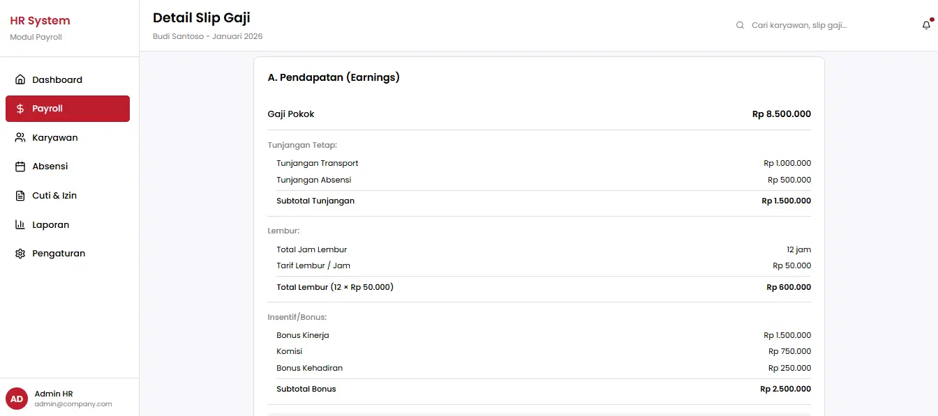 - Tunjangan: Komponen tetap yang termasuk tunjangan hari raya, absensi, dan transport. Sistem payroll memastikan perhitungan tunjangan dilakukan dengan mudah.