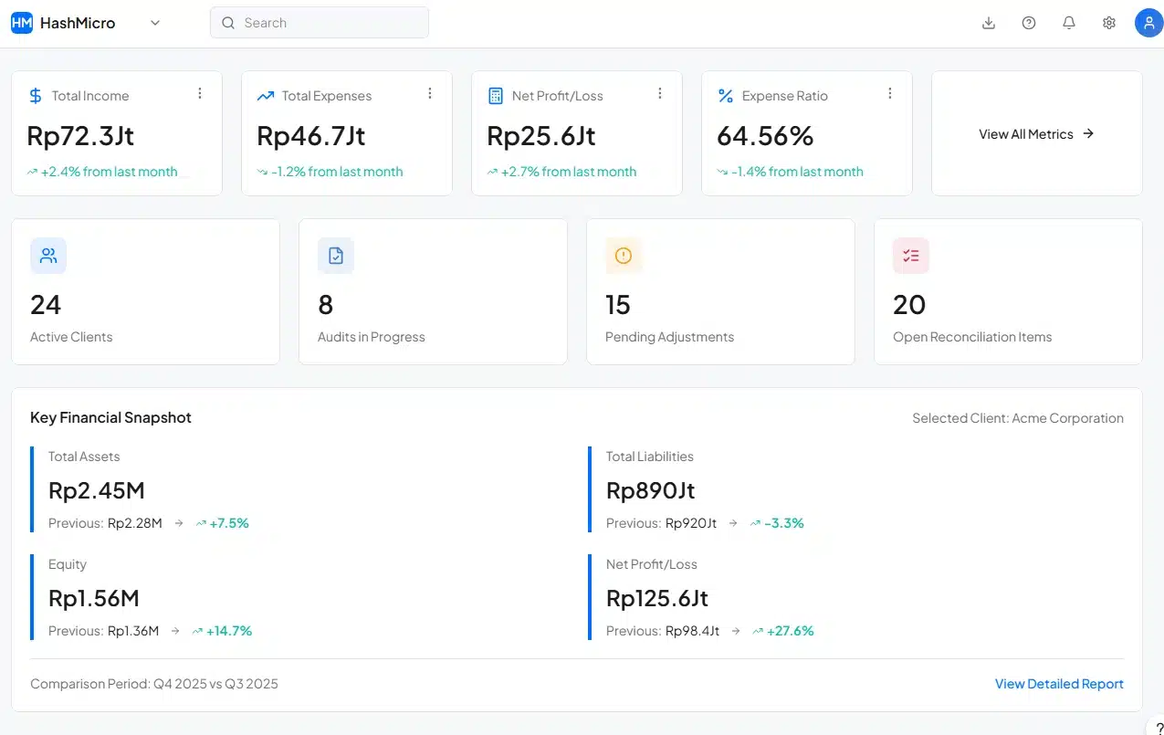 • Dengan sistem akuntansi Hashmicro, Anda sebagai akuntan publik mendapatkan kemudahan melalui otomatisasi dan fitur lengkap yang mempermudah pekerjaan.