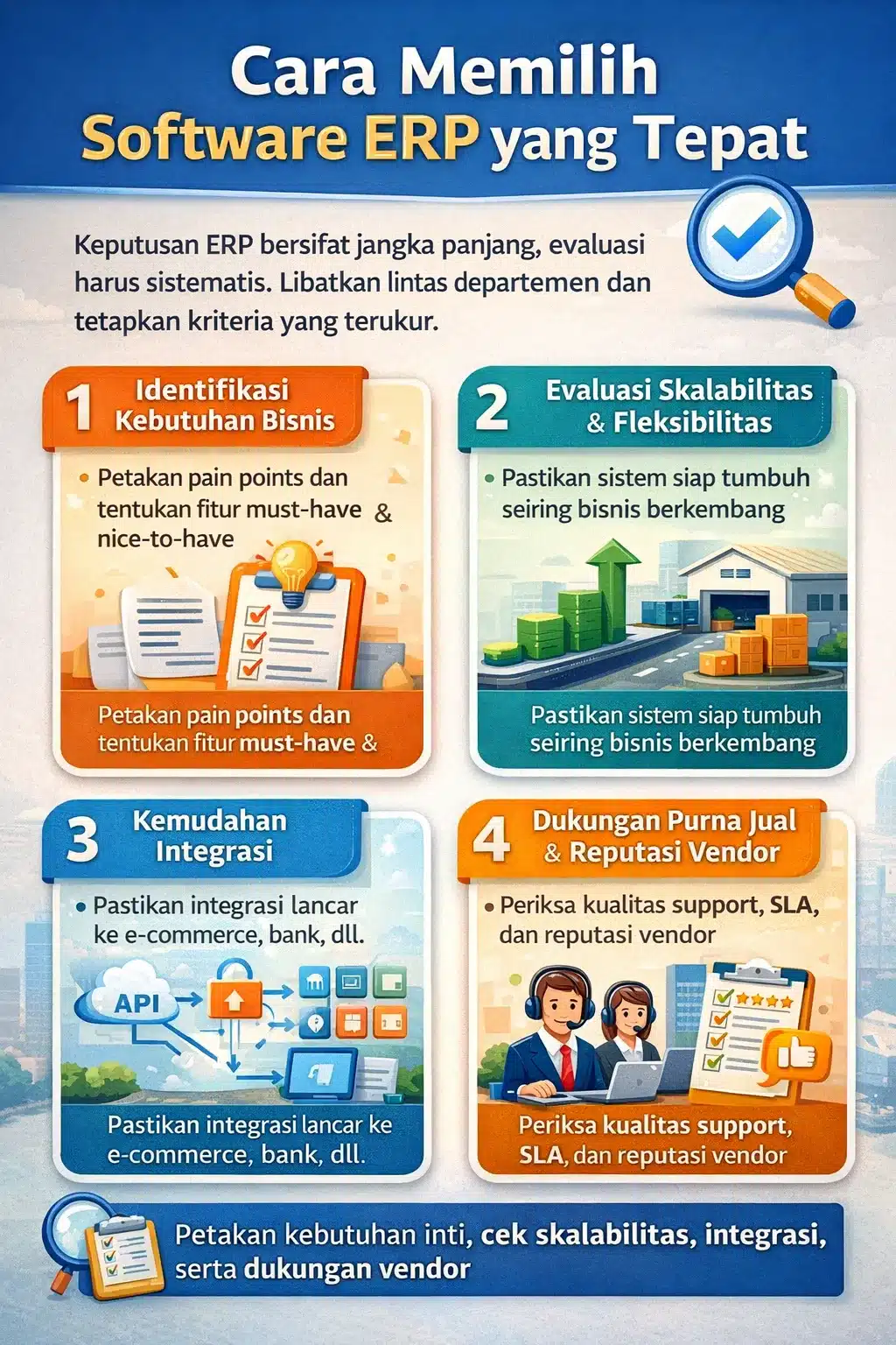 Keputusan ERP bersifat jangka panjang, sehingga evaluasi harus sistematis. Libatkan lintas departemen dan tetapkan kriteria yang terukur.