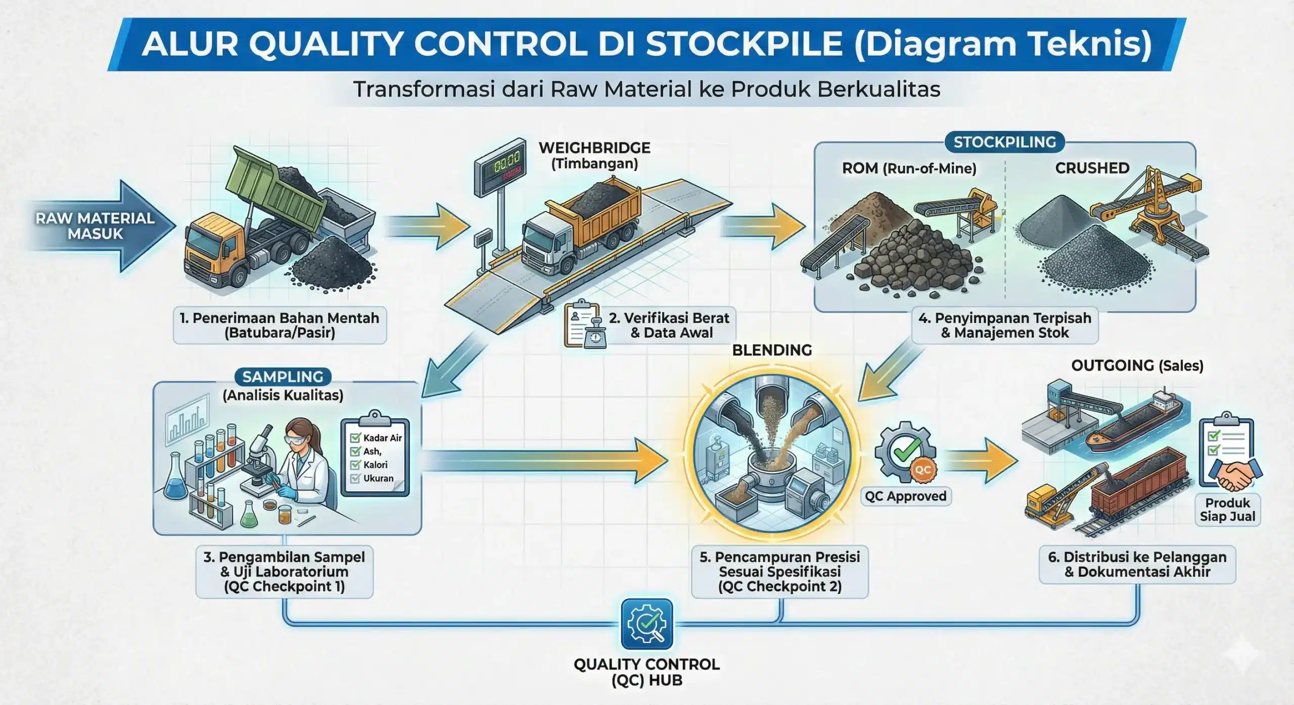 Keberadaan stockpile memastikan rantai pasok tetap berjalan meski terjadi gangguan di area pit. Tanpa pengelolaan yang tepat, tumpukan ini bisa menjadi sumber kerugian akibat degradasi kualitas material.