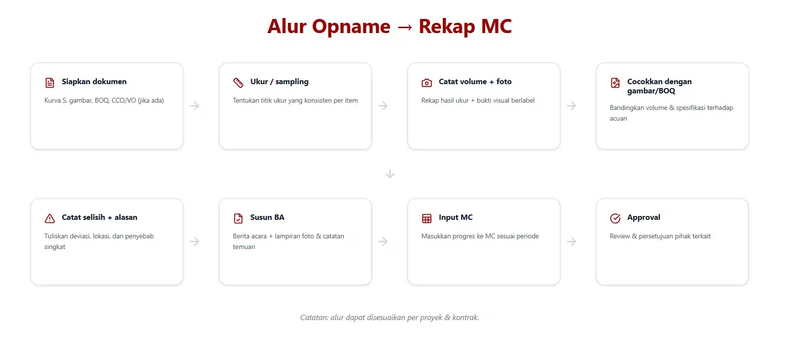 Hindari opname yang baru dilakukan ketika pekerjaan hampir selesai, karena selisih volume dan temuan kualitas biasanya sudah menumpuk. Lebih aman jika opname dilakukan bertahap mengikuti item yang berjalan. Misalnya setelah satu scope selesai (bekisting, pembesian, pengecoran, finishing) atau sebelum pengajuan MC