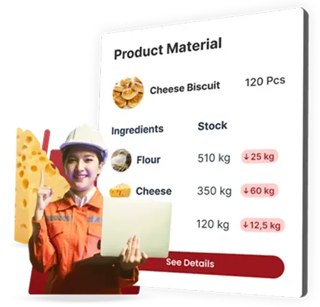 Dapatkan gambaran jelas terkait production plan, progress report, BoM, work order, dan produk jadi.