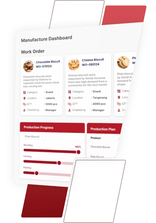 Lancarkan siklus produksi dari planning, scheduling, budgeting, QC, hingga maintenance secara sistematis dan efisien dengan software manufaktur all-in-one.