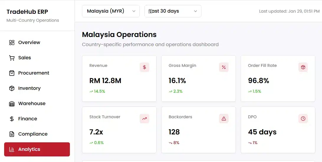 A trading-focused ERP platform typically integrates inventory, sales, procurement, and finance into a single workflow. With real-time visibility and automated reporting, teams can collaborate more quickly, reduce manual errors, and meet compliance requirements with more consistent data.