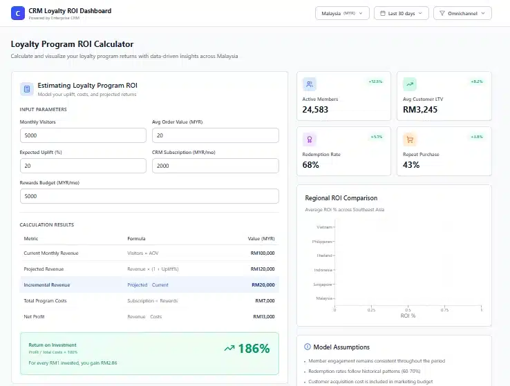 Many Malaysian businesses delay adopting loyalty software because the return feels hard to quantify upfront. To make the decision more measurable, below is a simple ROI simulation using a standard formula and realistic assumptions for a mid-sized retail outlet in Kuala Lumpur, with a 20% target uplift driven by improved repeat purchases and higher average spend.