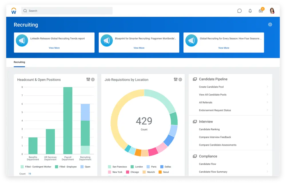 - Recruiting and talent management: It supports the recruitment process and talent management, helping businesses attract, develop, and retain top talent.