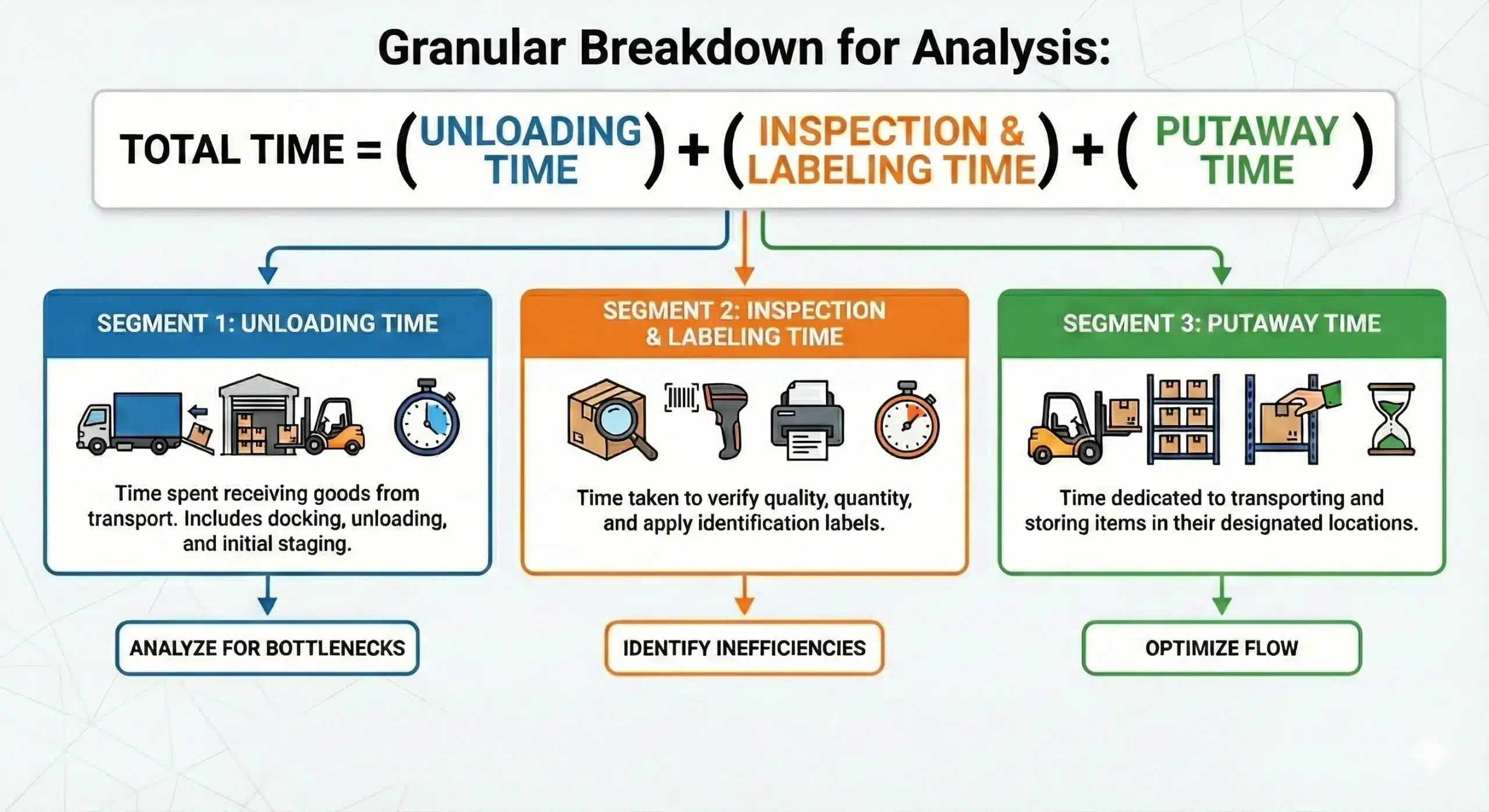 The core metric for this process is the Cycle Time Duration. However, simply knowing the start and end times is often insufficient for deep analysis. To get actionable insights, you should measure the total time relative to the specific phases of receiving.