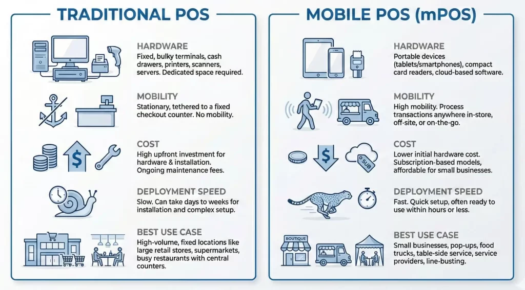 In addition to hardware differences, cost structure and deployment flexibility also vary. Traditional POS systems often require higher upfront investment in equipment and installation. In comparison, mPOS generally involves lower hardware costs but may include transaction-based processing fees. Businesses should evaluate operational scale, transaction volume, and integration requirements when comparing both options.