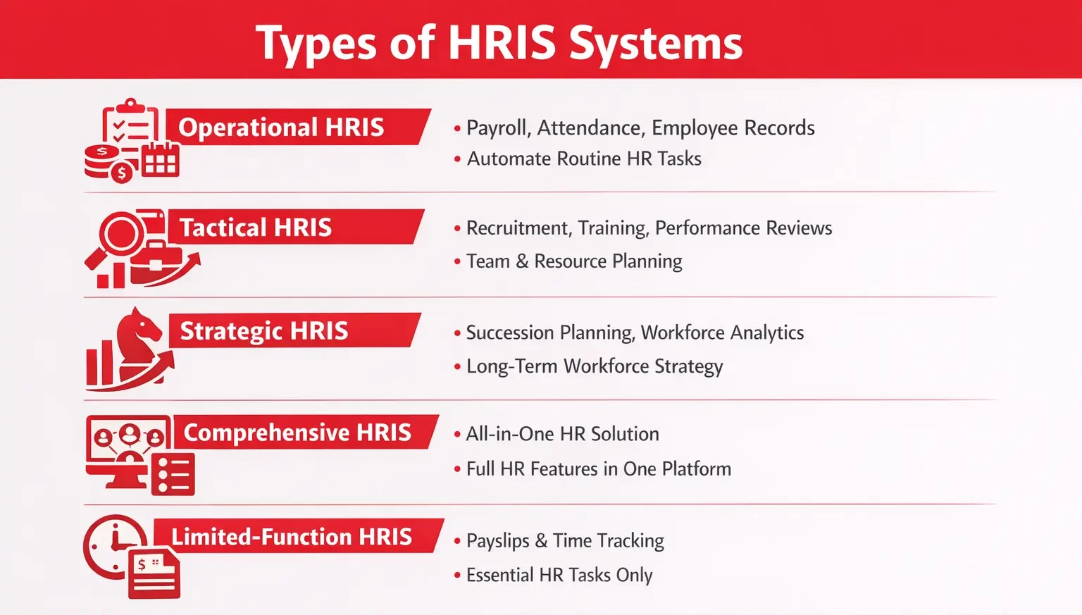 Human Resource Information System (HRIS) come in different types depending on what the company needs, whether it’s handling day-to-day tasks or supporting long-term goals. Here are the five main types of HRIS and what each one is for: